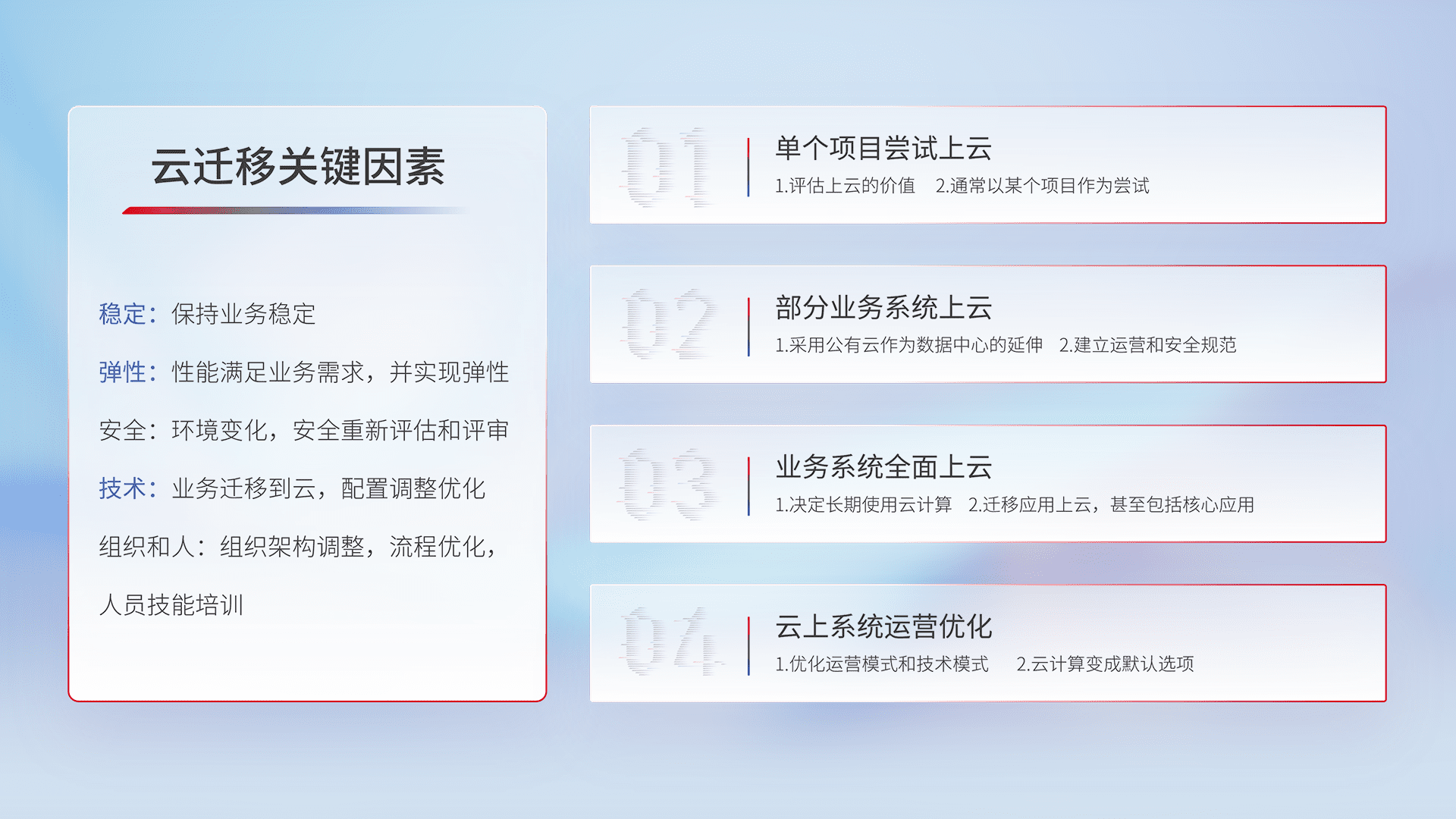 结合实际业务,,,从规划设计、、云平台选型、、、、云原生改造、、、数据迁移、、集成交付,,,迁移全过程为客户识别最佳上云路径,,,做好风险识别管理,,,,设计网络架构、、身份权限、、、安全审计合规、、操作审计、、、、日志审计、、、监控告警策略、、、、多站点容灾设计等,,,,对云上基础设施进行整体规划,,提升IT治理水平,,以满足弹性、、高可用、、高性能的需求。。。