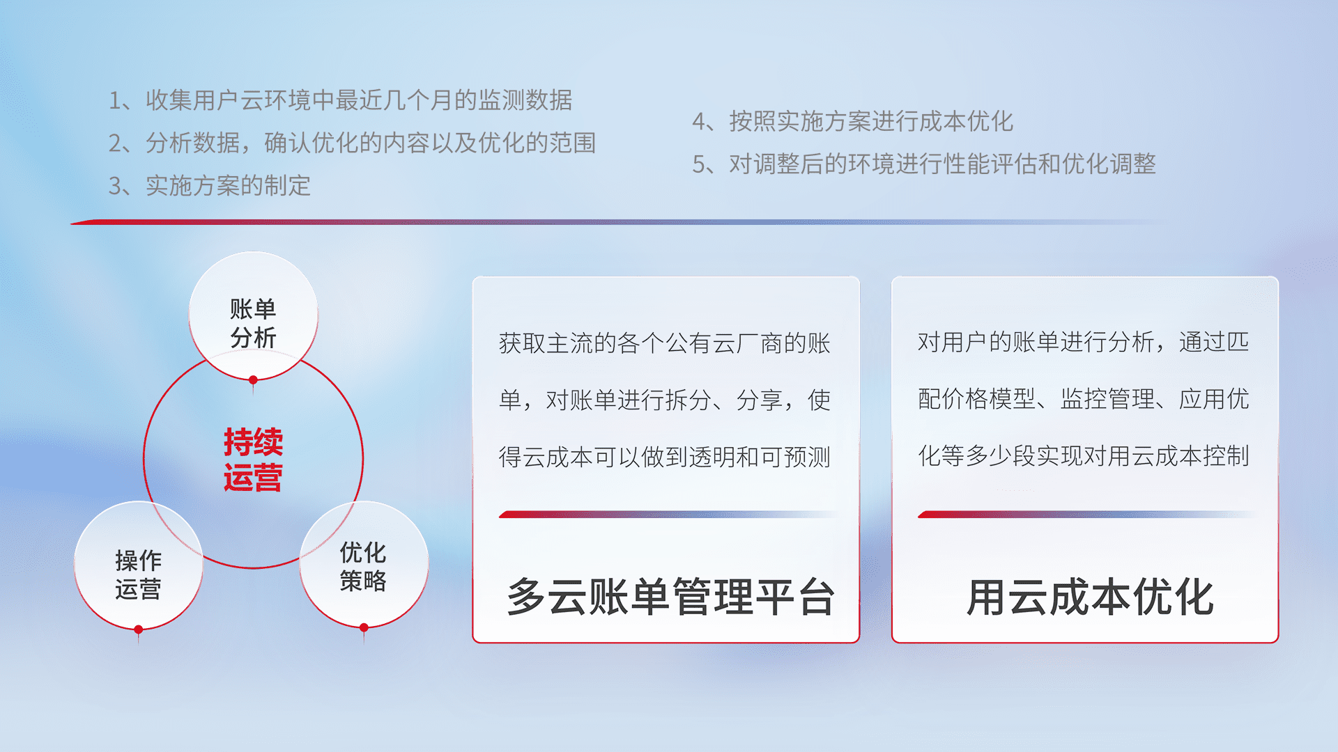通过多云纳管,,,以统一的资源数据模型把客户的云资源进行抽象和封装,,,进而实现对多云资源的统一操作,,,保障云资源管理的可靠性、、、、稳定性与可用性。。量身定制化运维内容,,配置、、、、开发运维、、、、补丁管理、、、、备份、、监控、、、、认证和访问管理、、、、审计和日常巡检等,,保障在用云过程中的可靠度,,,,稳定度以及高可用率。。