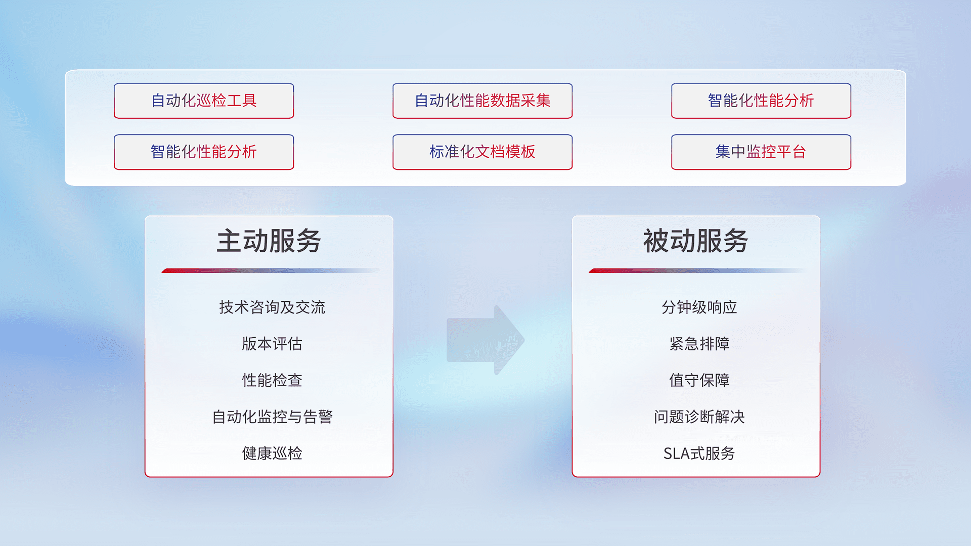 智能化工具和标准化文档,,保障服务质量,,,,提供主动服务(包含技术咨询、、版本评估、、性能检查、、、、自动化监控与告警、、、、健康巡检)和被动服务包含(分钟级响应、、、紧急排障、、、值守保障、、、问题诊断解决、、、、SLA服务)。。